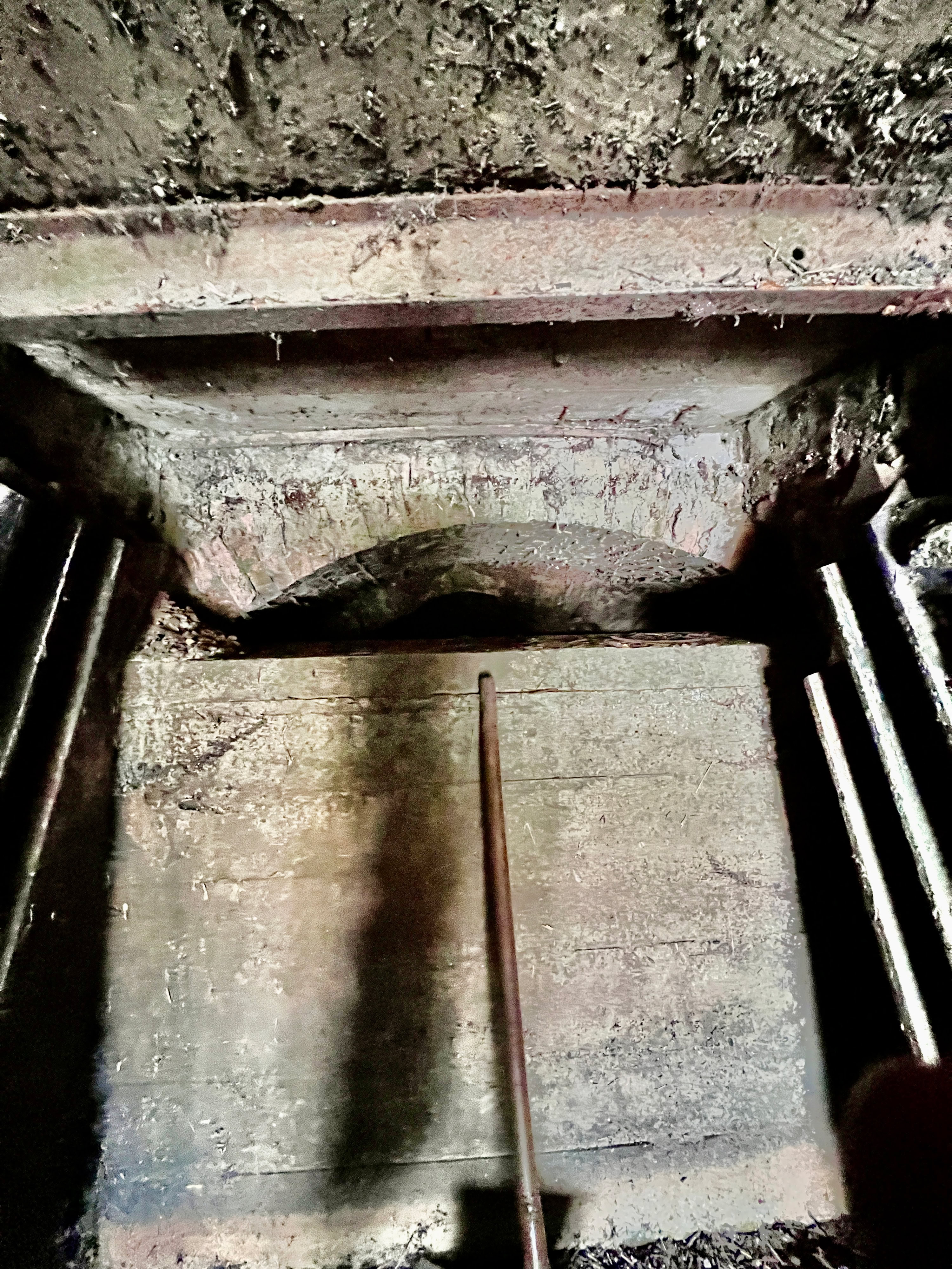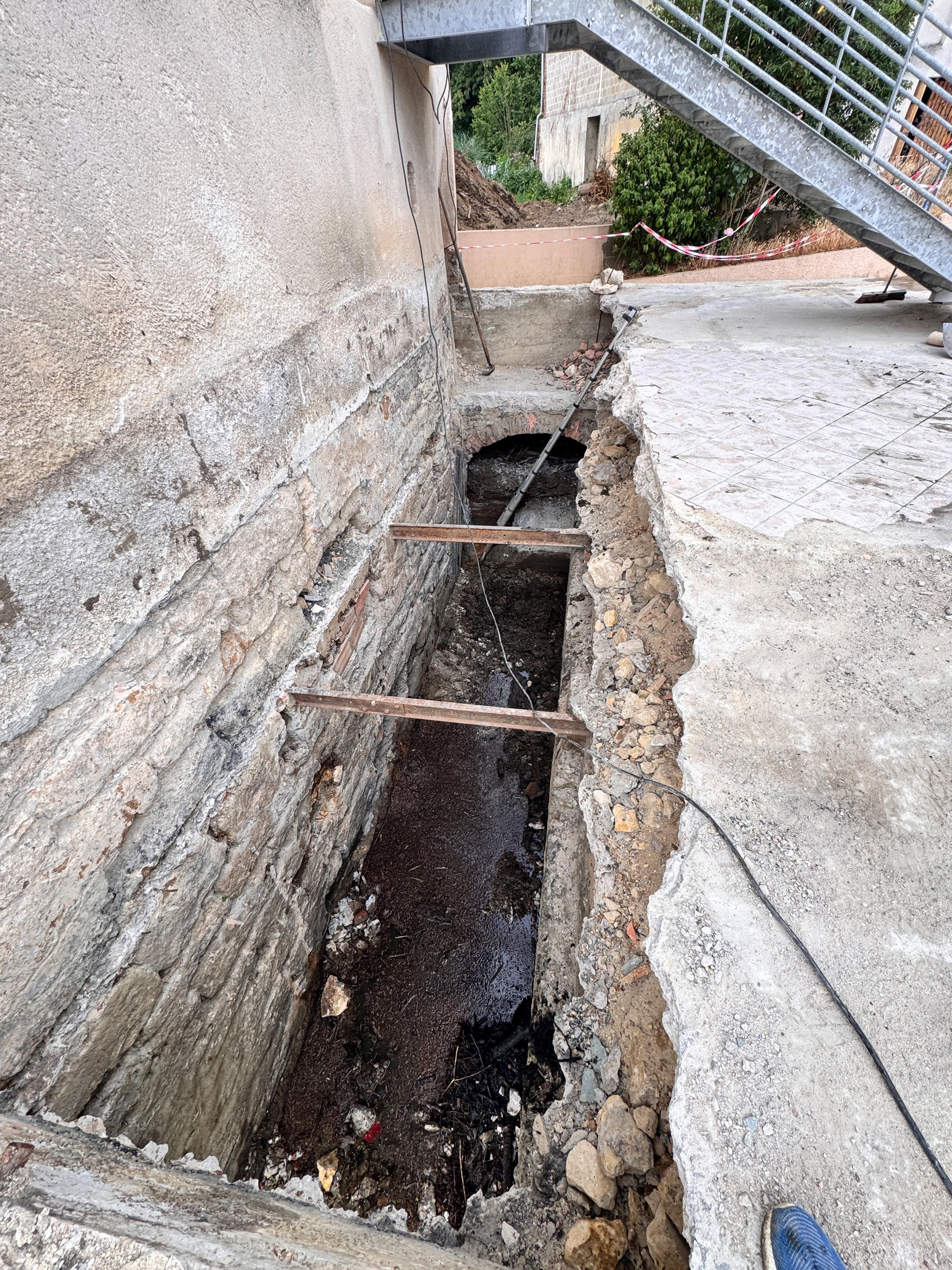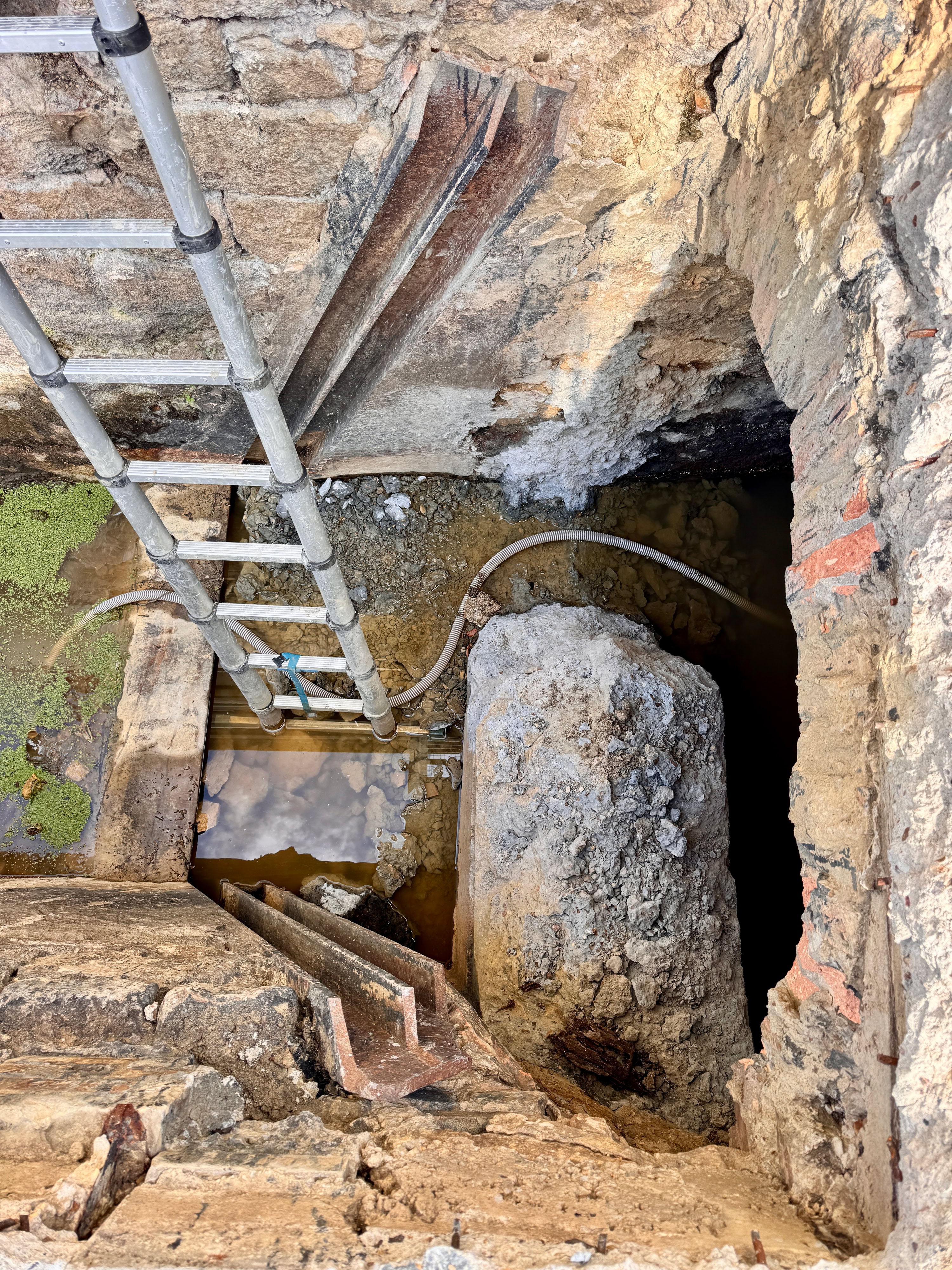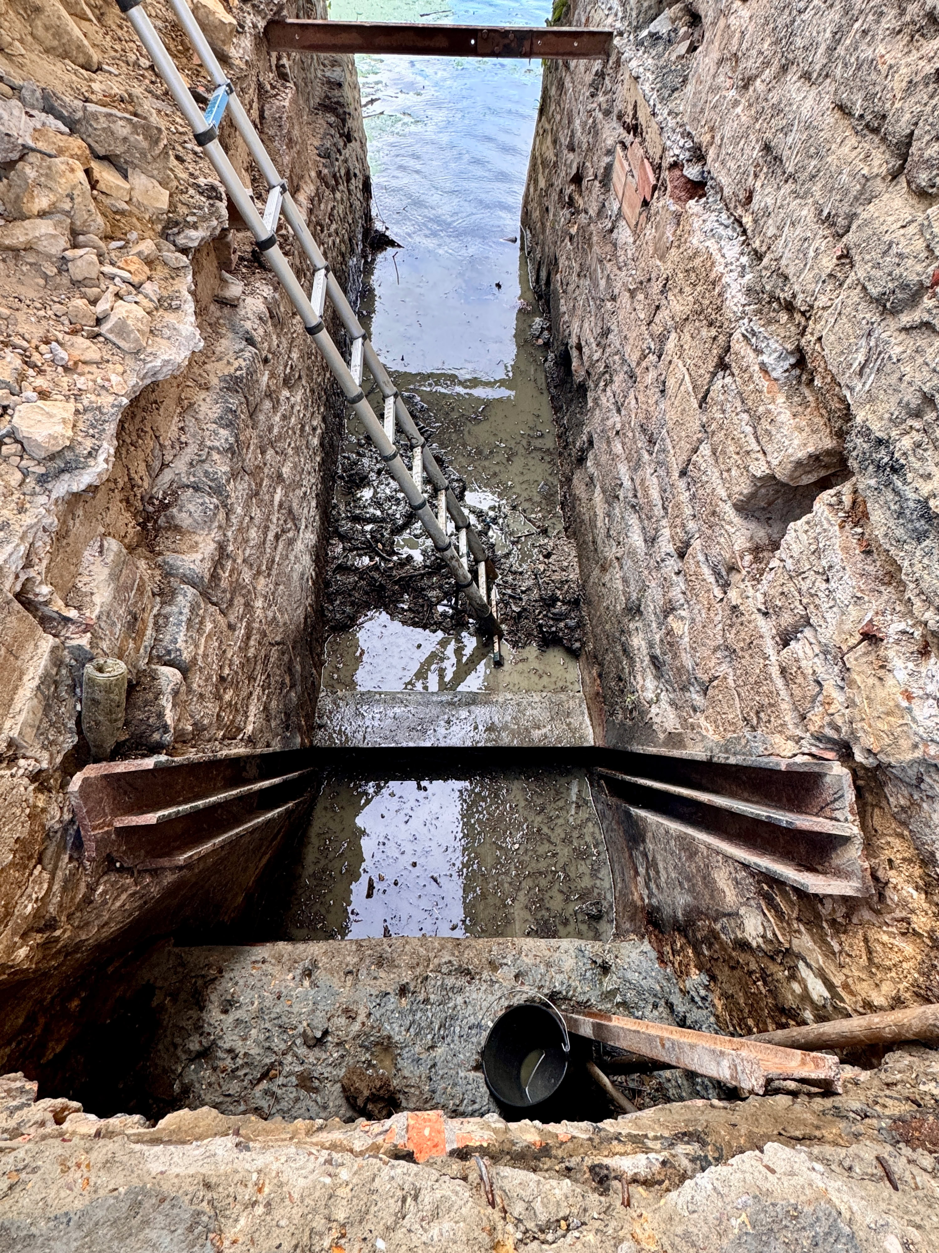 Lors des écourues de 2022 le coursier était accessible à pieds secs, d’ailleurs on voit bien la trace de l’eau en bas du mur. En haut de la photo est visible une des trois poutrelles qui soutiennent la dalle.