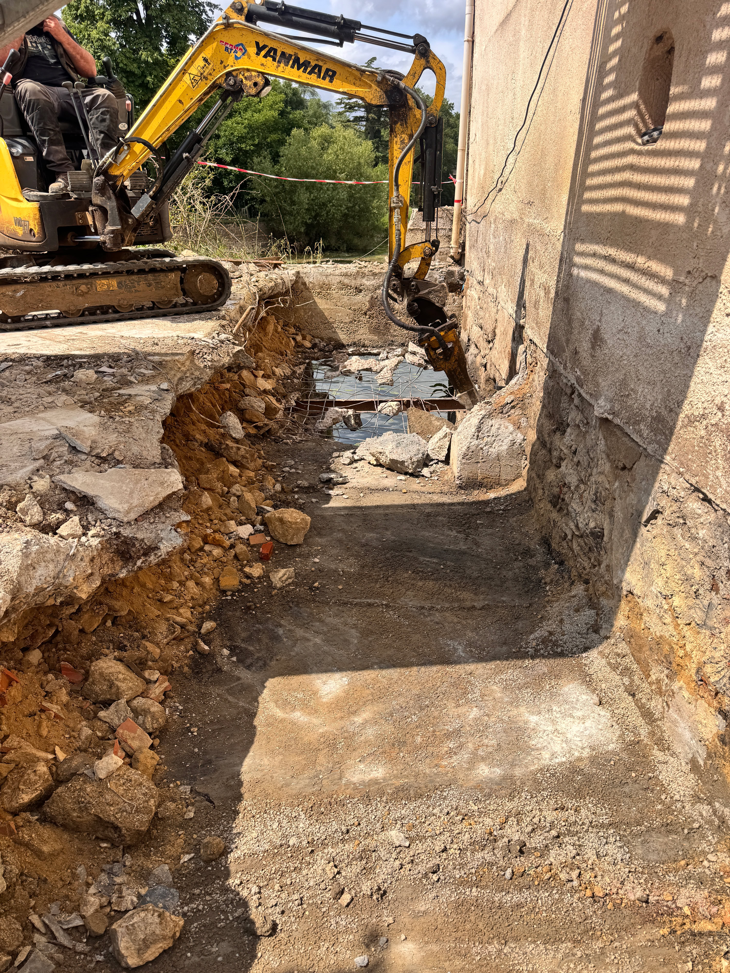 Au début août 2025 le mur n’existe plus. Il ne reste plus qu’à enlever les débris de béton qui rejoindrons le bon bac de tri de la déchetterie. Le travail de prolongement des glissières et la pose de la vanne va commencer. Pas question de vider la Sarthe en cas de crue.