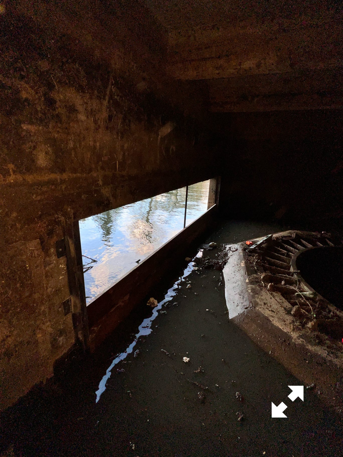 Sous le moulin dans la partie normalement sous eau lorsque qu’une vanne existait et produisait de la force rotative, il d’abord fallu nettoyer en prenant garde où les pieds se posaient. Outre les embâcles il y a l’énorme trou correspondant à la turbine