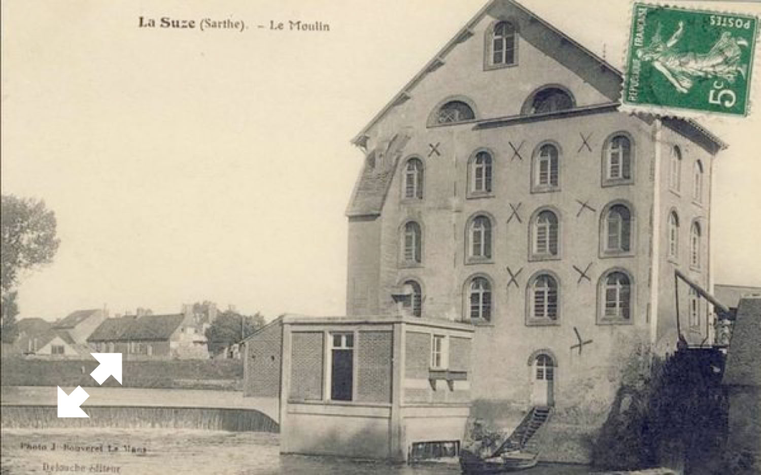 Sur la gauche de la photo on voit clairement l’existence du moulin à tan détruit depuis. Cette image est une photo du moulin prise par Claudine la photographe de La Suze sur Sarthe maintenant en retraite.