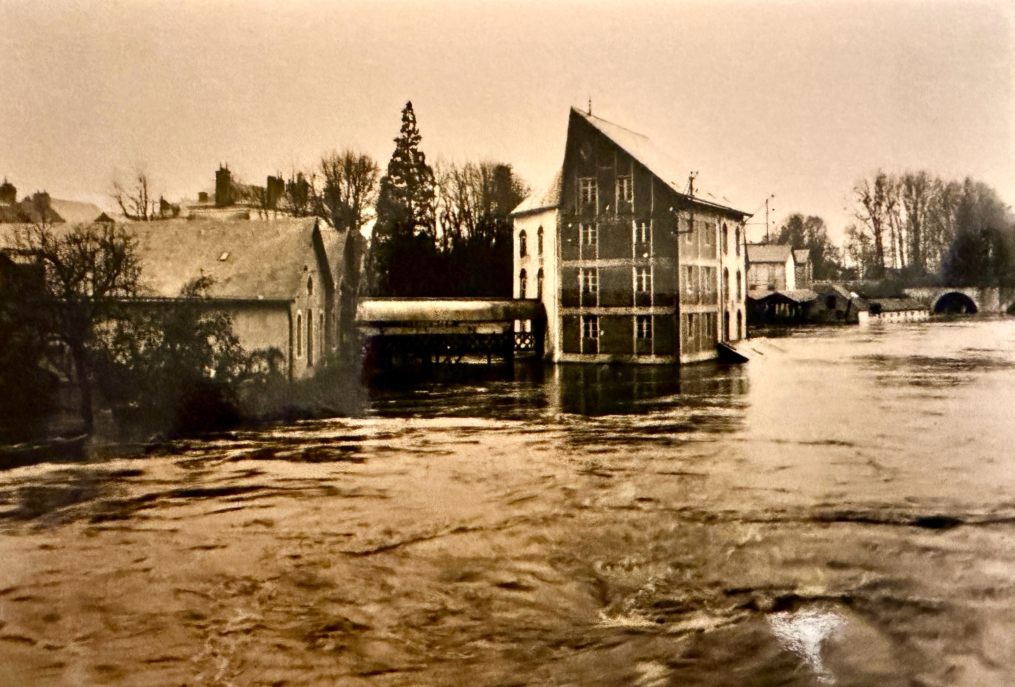 Photographie d’une carte postale des années 1930. Le seuil a complètement disparu sous l’eau. Tout le rez de chaussée est sous l’eau. Les deux coursives sont présentes et l’annexe du moulin n’a pas été remaniée. La cour n’a pas été construite.