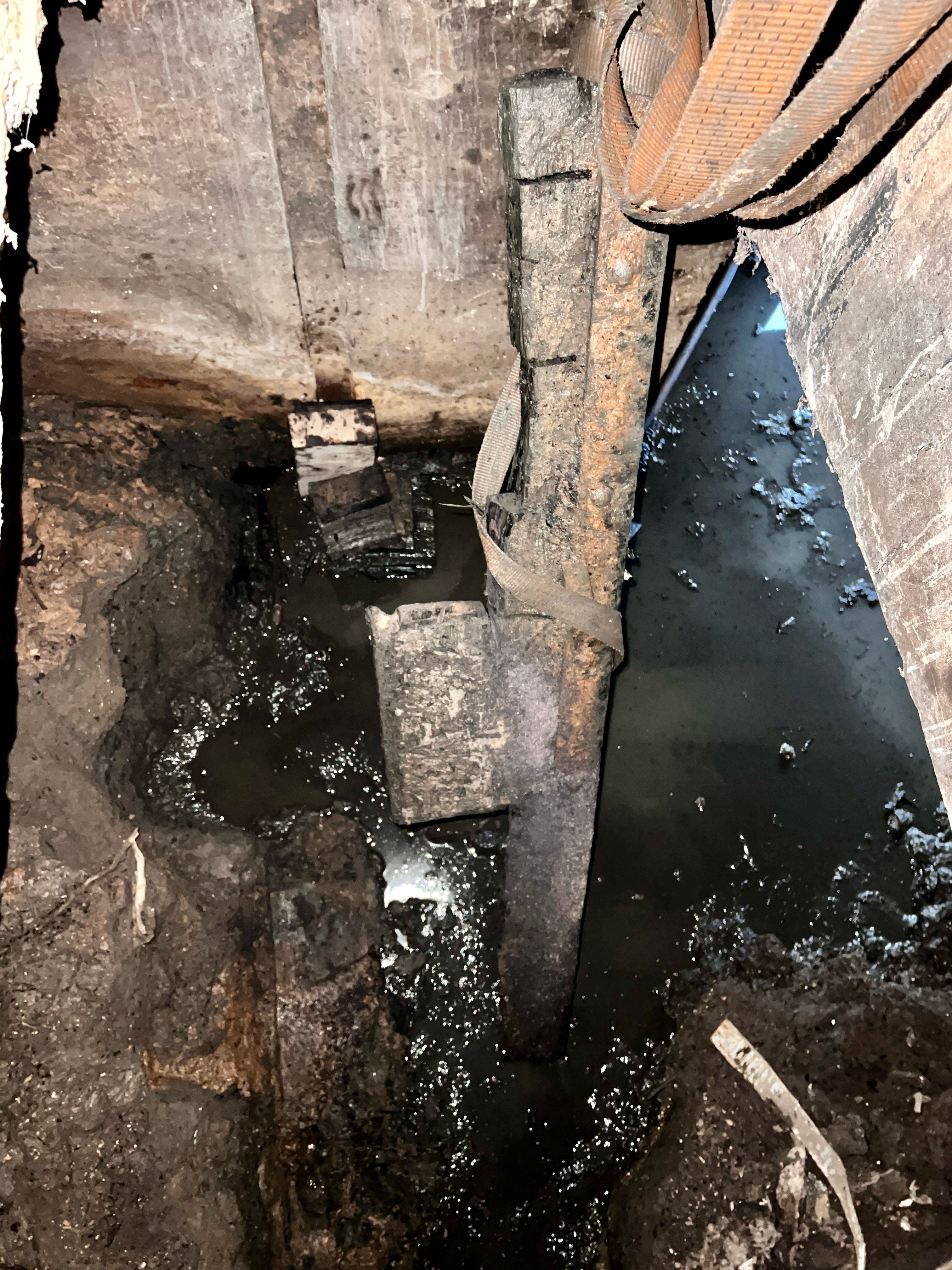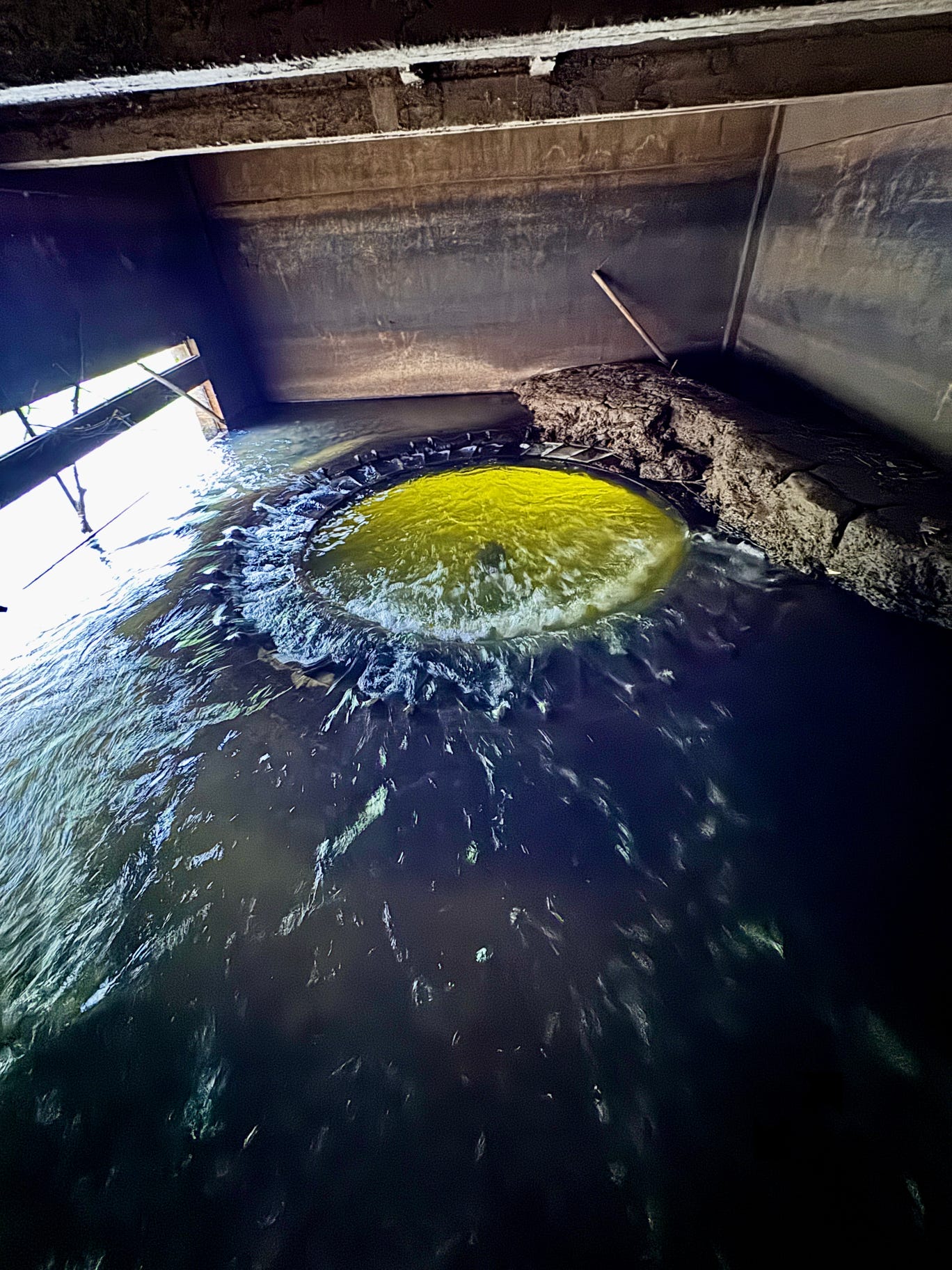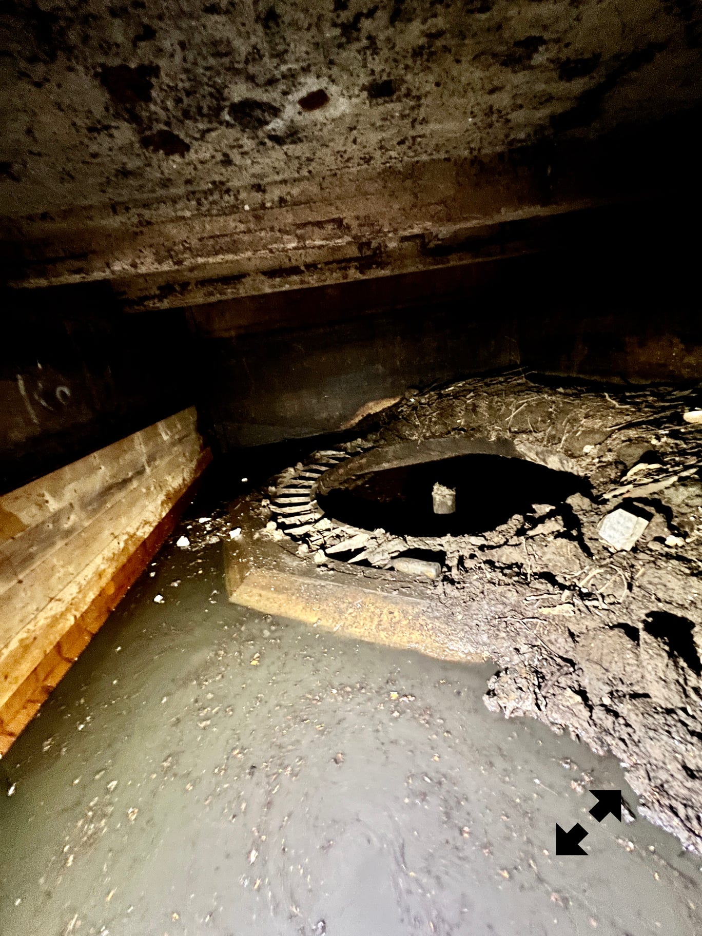 Sous le moulin dans la partie normalement sous eau lorsque qu’une vanne existait et produisait de la force rotative, il d’abord fallu nettoyer en prenant garde où les pieds se posaient. Outre les embâcles il y a l’énorme trou correspondant à la turbine