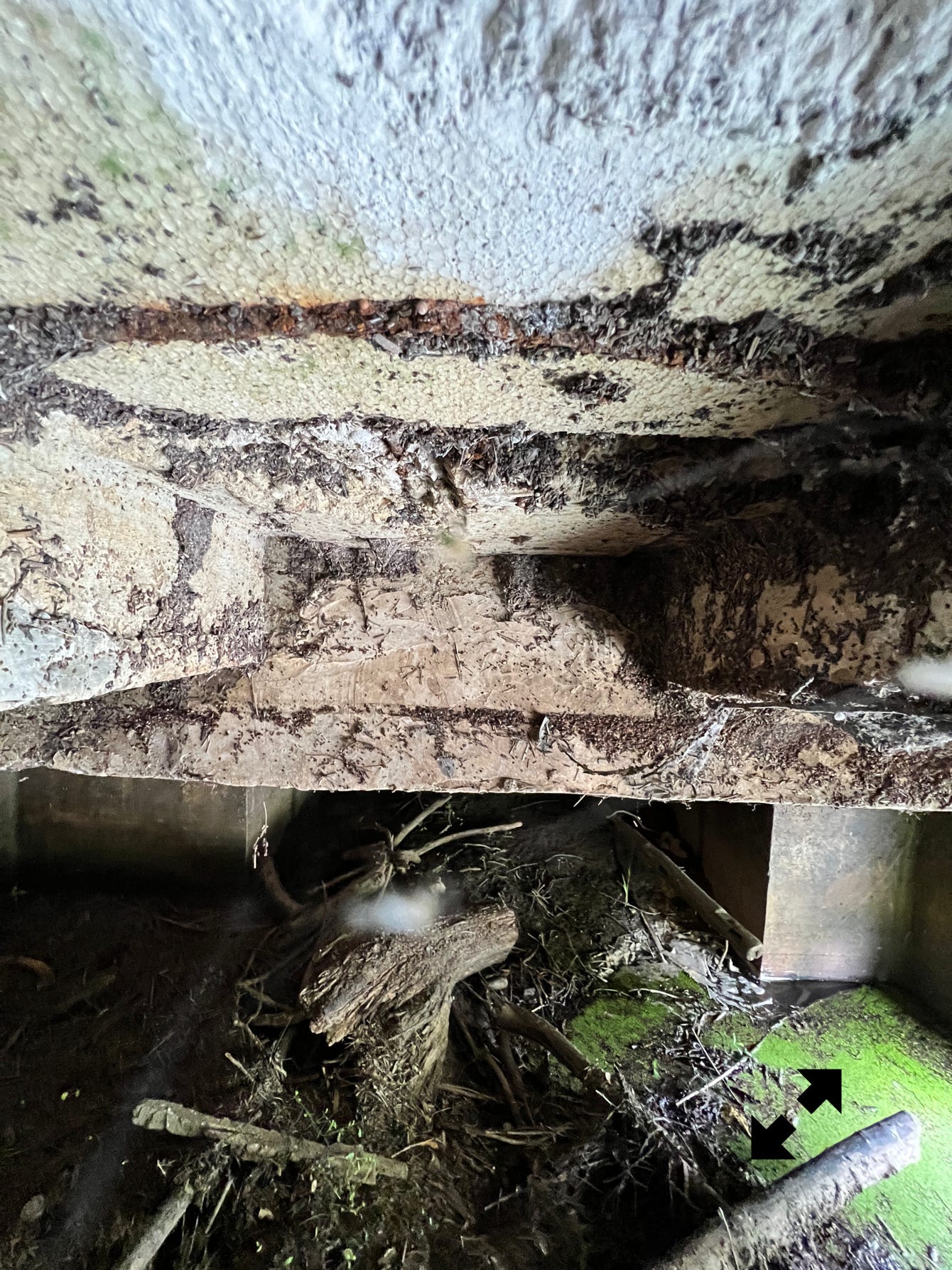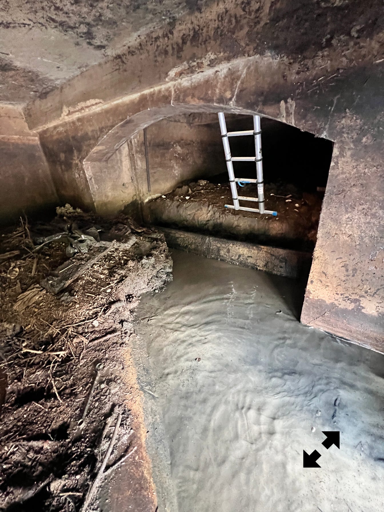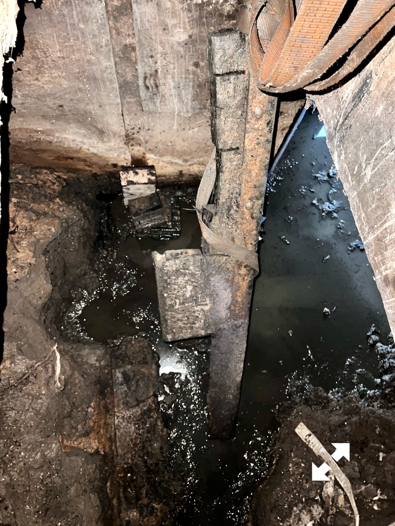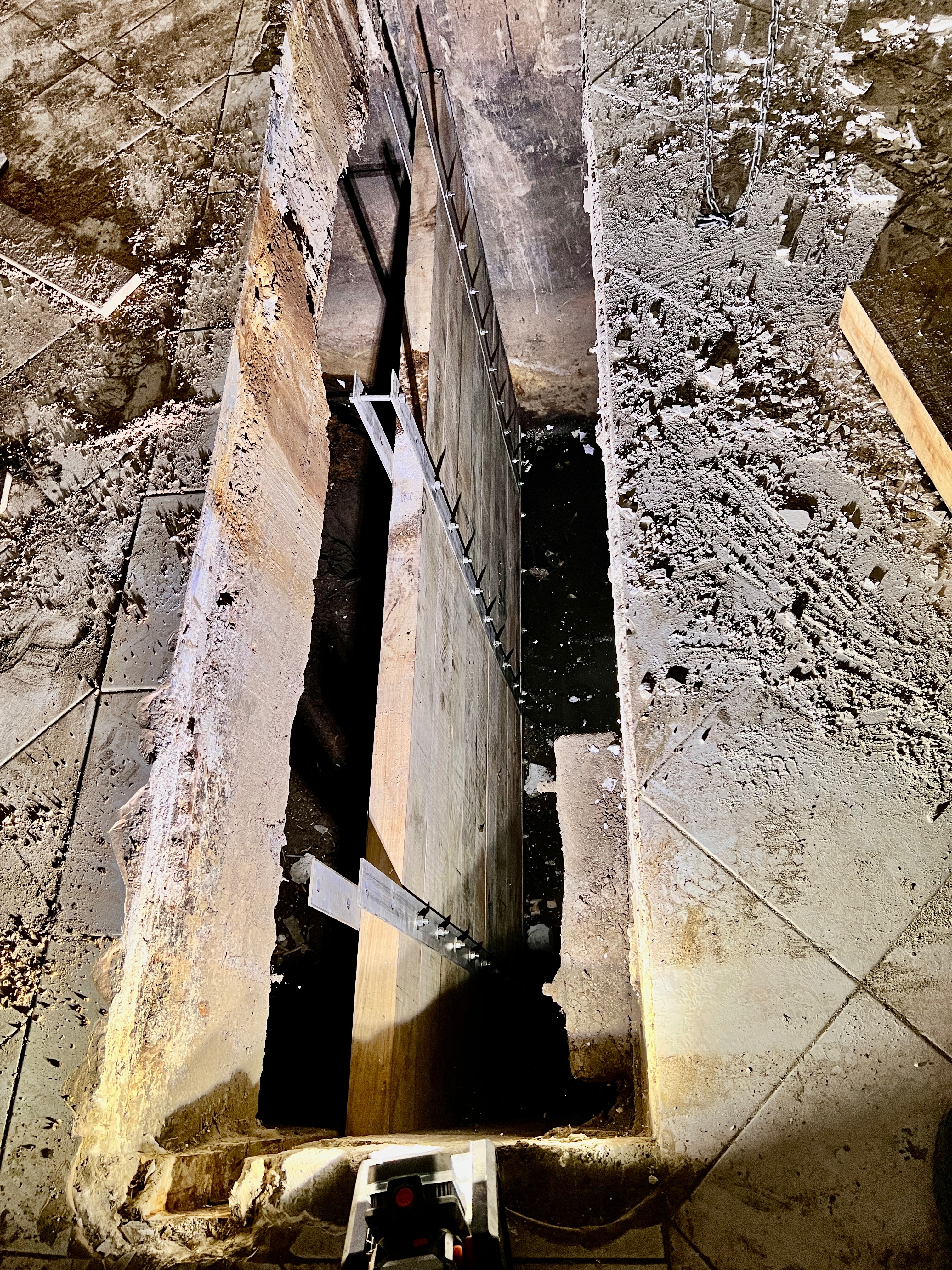 Sous le moulin dans la partie normalement sous eau lorsque qu’une vanne existait et produisait de la force rotative, il d’abord fallu nettoyer en prenant garde où les pieds se posaient. Outre les embâcles il y a l’énorme trou correspondant à la turbine